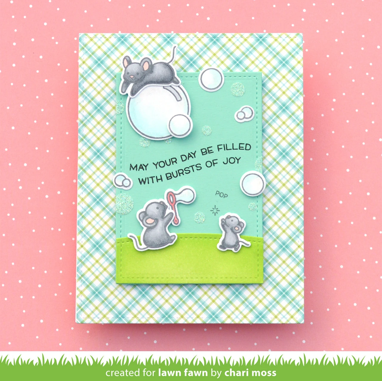 Coordinating Set Ideas: To make an interactive card, pair this set with Swish ‘n Pop Pull Tab! For more bubbles and bubbly sentiments add Scripty Bubble Sentiments, or use with Dandy Day to create a cute scene with mice playing with bubbles and dandelions. Mix this stamp set with Rub-A-Dub-Dub to create a fun, bubbly, bathtub scene. To create a bubbly backdrop, use Bubbles Stencil and Bubble Background Stencils. For even more bubble fun, use Bubble Border!