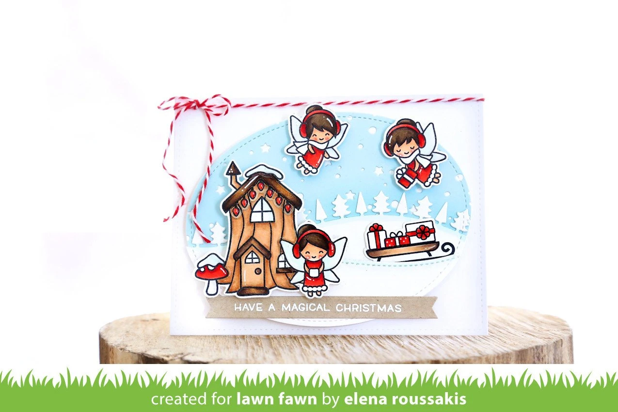 Have a “fairy” magical holiday with these whimsical clear stamps! This set features the fairies from Fairy Friends dressed in winter wardrobes, complete with frosty accessories, pine needle branches, and a tree trunk house just waiting to be decorated.