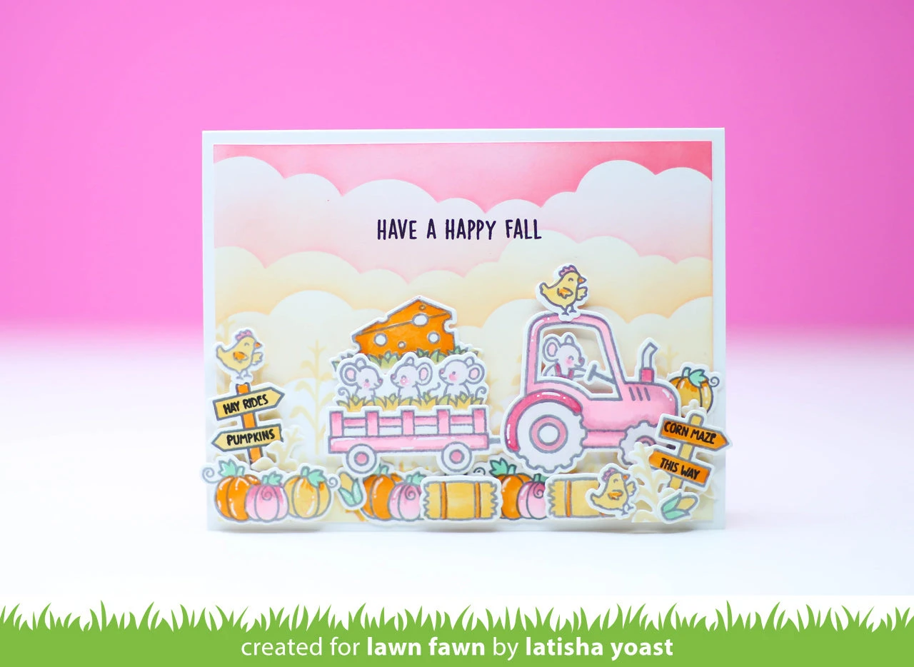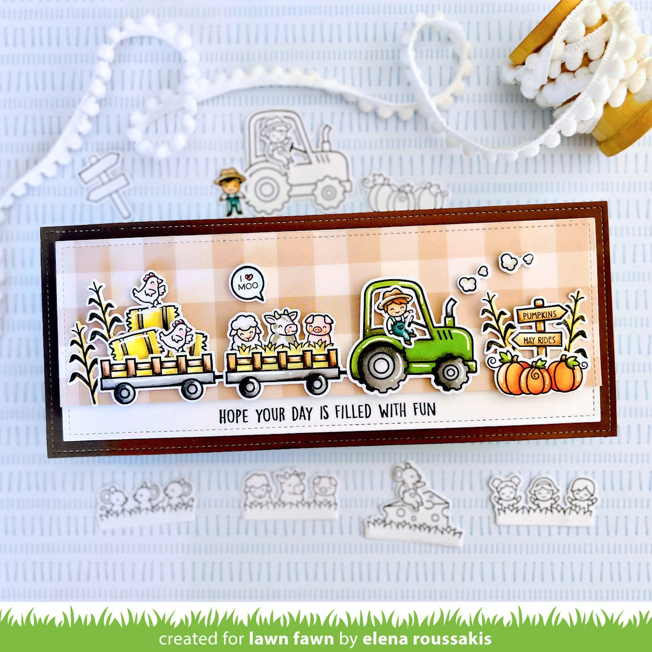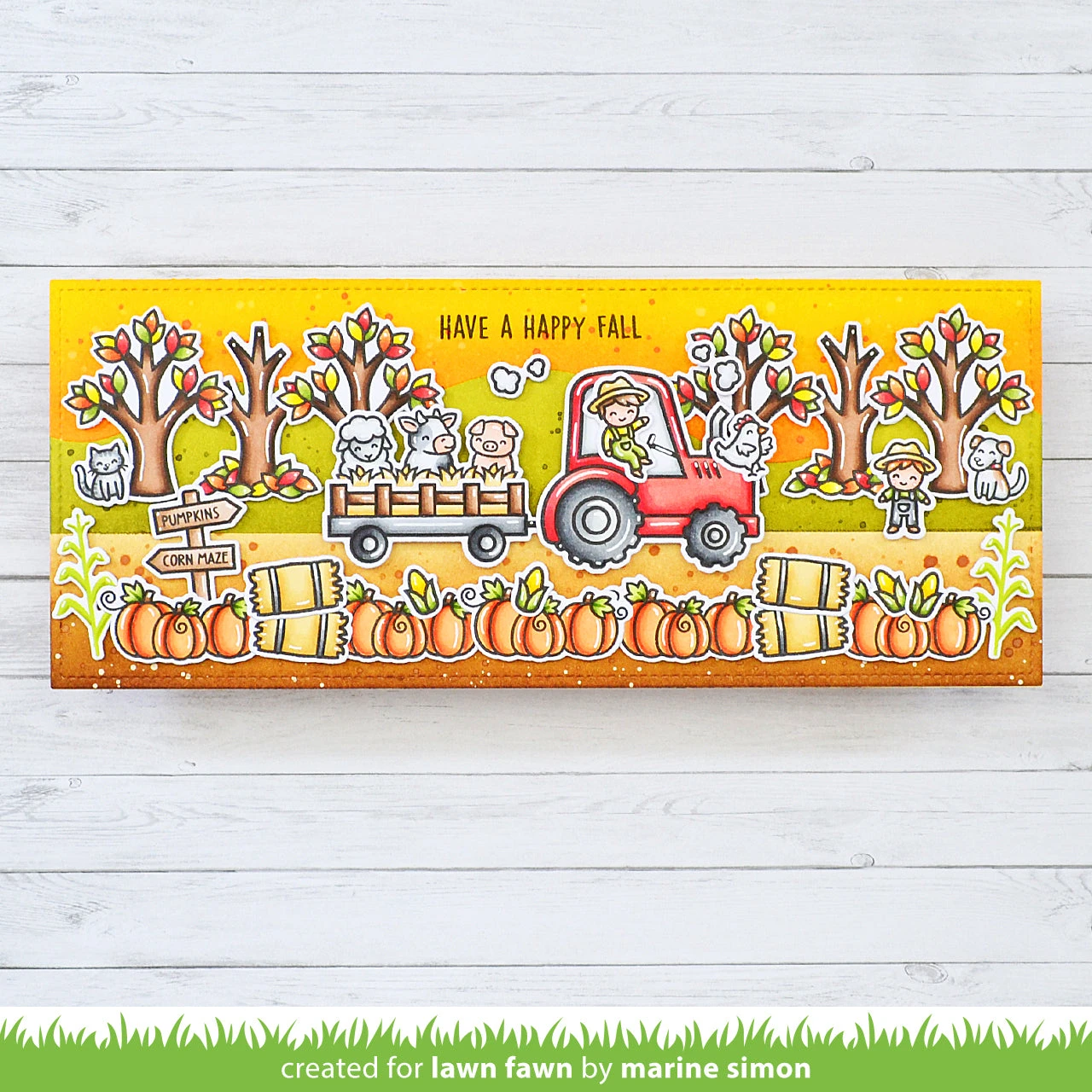 Coordinating set ideas: Build your harvest scene with lots of fall trees using Tree Before n’ Afters, Little Picket Fence Border, and Grassy Hillside Borders. Add more farm friends with Tiny Farm and Hay There too!