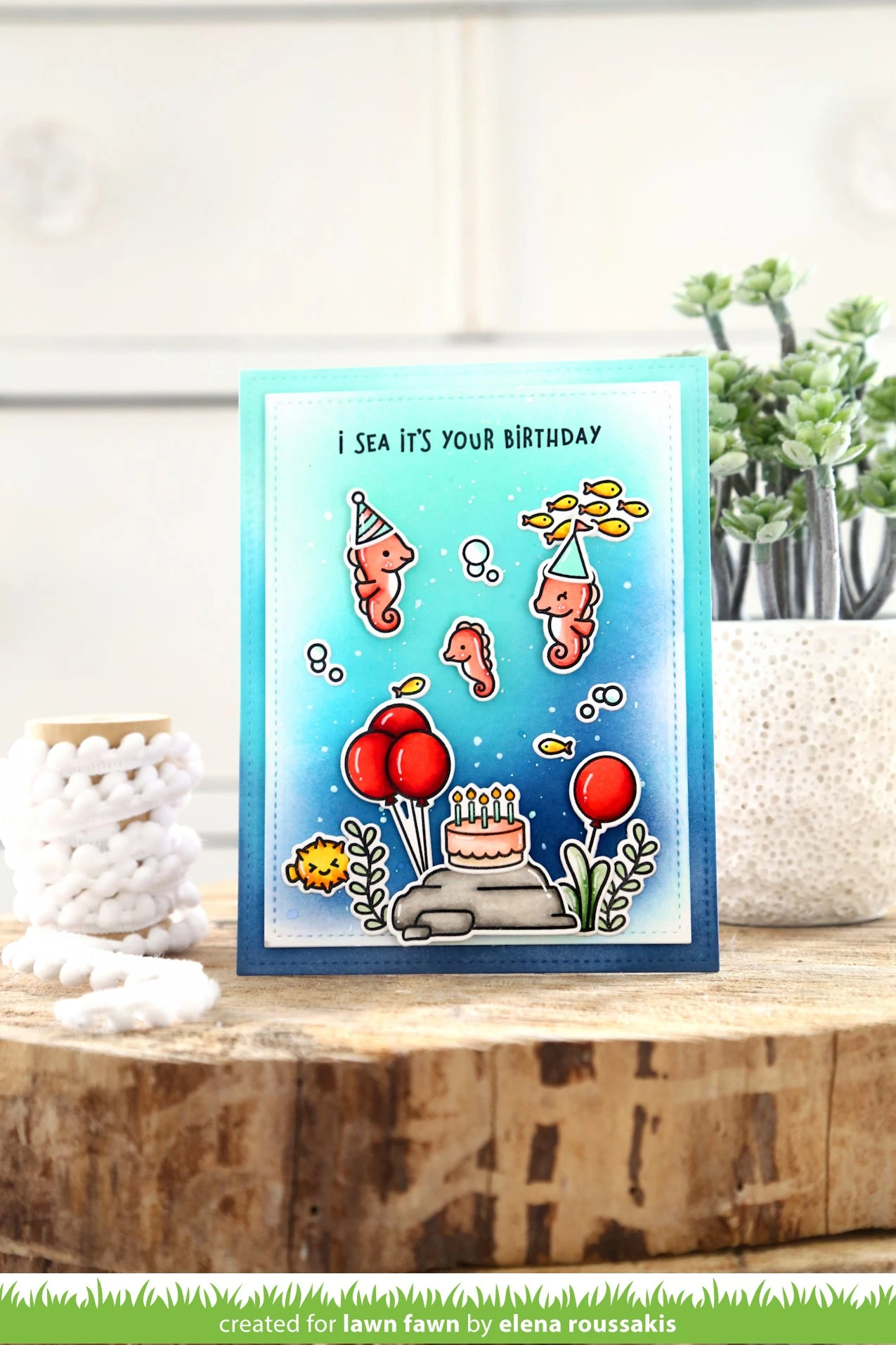 We’re not seahorsin’ around with this fun mini stamp set! This set features two cute seahorses that are ready to celebrate a birthday or other occasion.