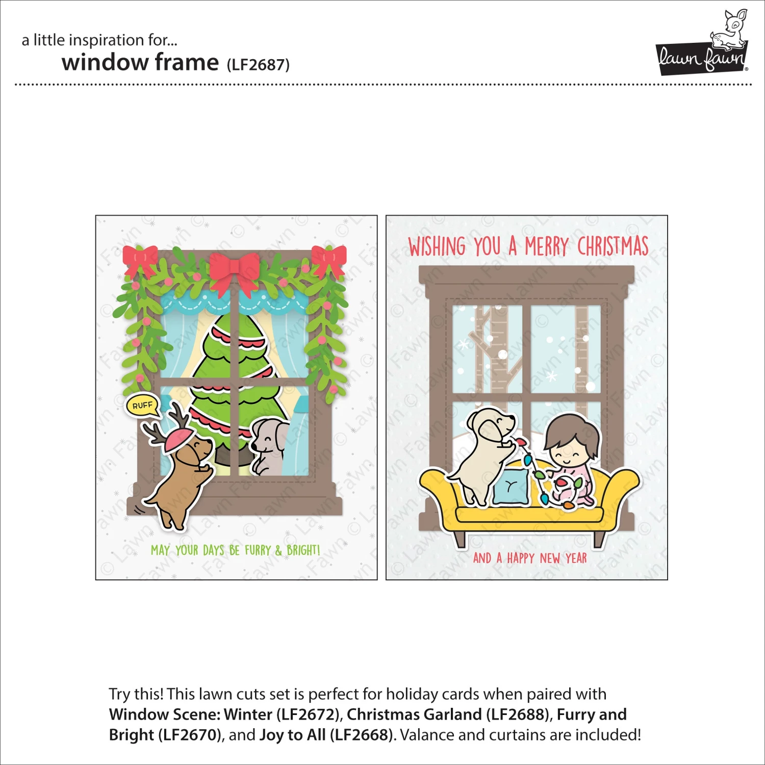 Coordinating set ideas: Pair this set with Window Scene: Winter to create a beautiful winter/holiday card. Add festive fun by decorating the window with Christmas Garland. Use Joy to All and Furry and Bright sets to craft a critter-filled snowy scene outside the window or a cozy scene inside!